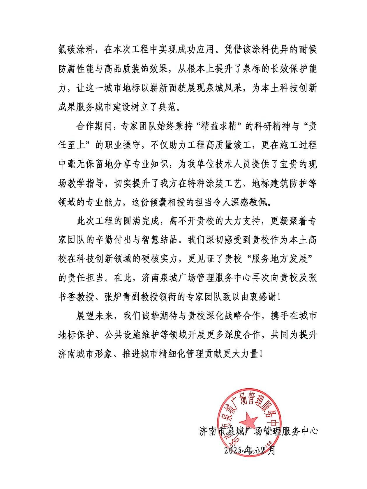 如今,泉标以焕然一新的姿态重新屹立于泉城广场,365上市公司官网的蓝色氟碳涂料,已悄然化为守护城市文化记忆的科技铠甲。这封感谢信的背后,是济南大学与泉城济南的双向奔赴、共生共荣,更是济南大学践行“学科赋能产业、科研服务城市”使命的生动实践。未来,济南大学将继续以学科建设为龙头,以科研创新为核心,带动更多团队扎根地方、服务地方,让更多“科技之花”在地方发展的土壤中绽放,为校地合作书写更多精彩篇章。