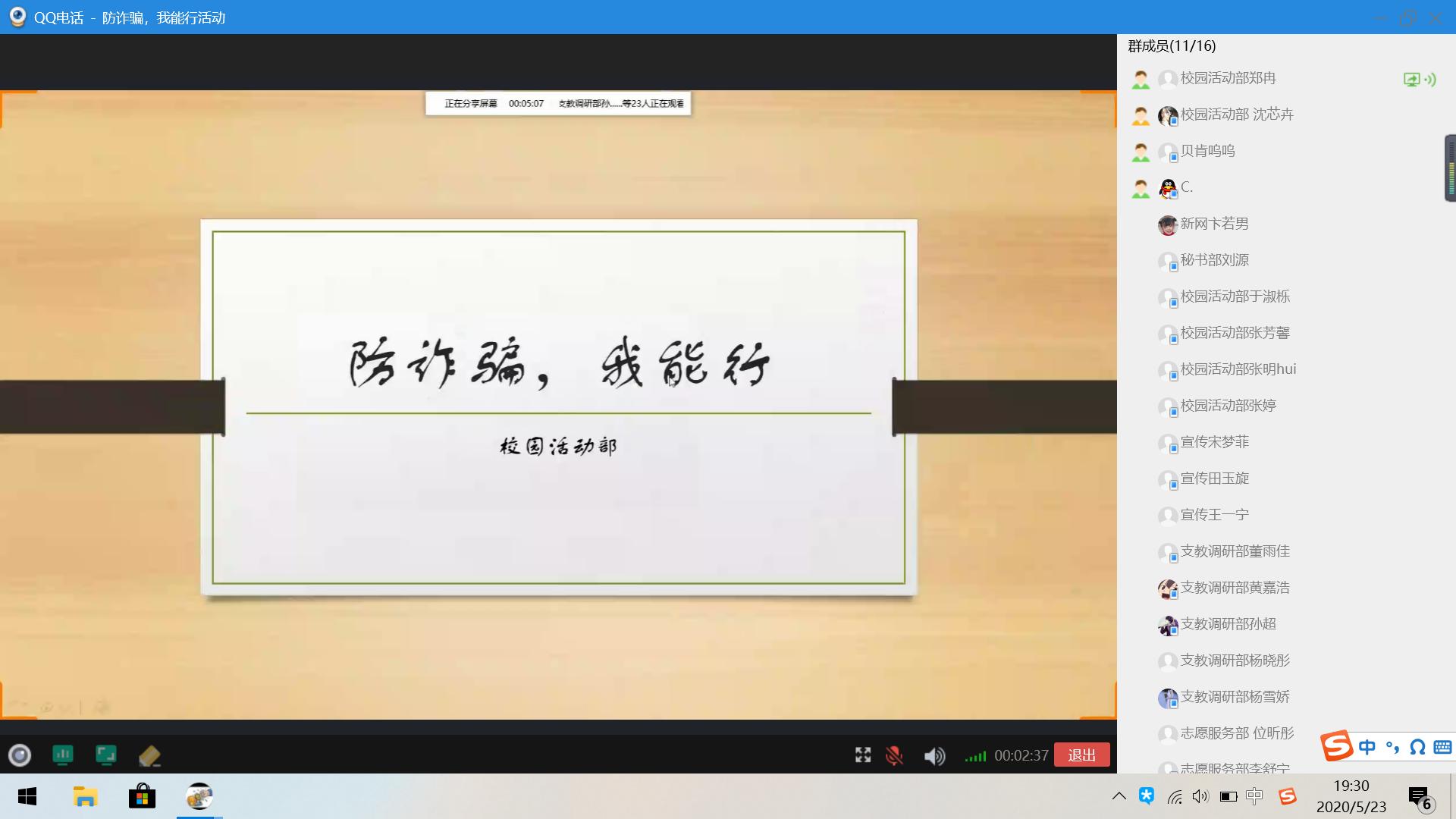晚七点半,活动参与者们准时进入线上会议室,本次活动正式开始。活动伊始,负责人向同学们简要介绍了活动流程,并强调了相关注意事项。随后,主持人郑冉同学就当前网络发展的新形势和常见的网络诈骗手段做了简单的介绍,并着重分享了与电信诈骗有关的PPT。郑冉同学围绕如何防范网络电信诈骗为同学们进行了讲说,以短视频的形式引出电信诈骗,从电信诈骗是什么、常见手段、如何识别以及受骗后的补救措施等四个方面详细介绍了网络电信诈骗的相关知识,并阐述了电信诈骗的众多消极诱因,总结了“防诈骗十守则”等预防补救措施,让在座的同学了解到了简易有效的防范电信诈骗方法。最后,郑冉同学做出呼吁,希望大家谨防电信诈骗,从自身做起,提高防范意识,净化网络环境。至此,本次活动圆满落下帷幕。