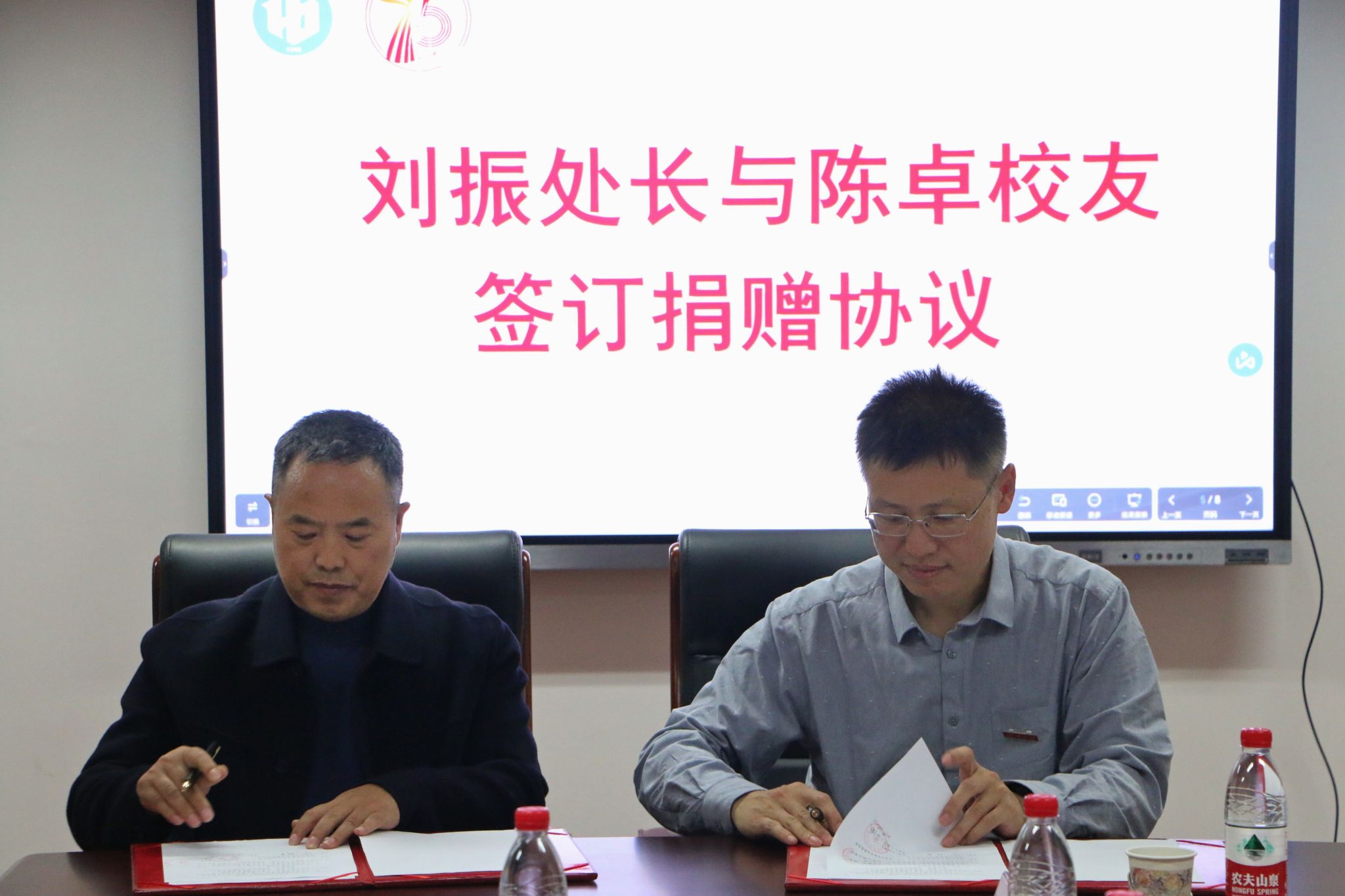 仪式上,教育发展基金会办公室主任刘振与陈卓、陈成文、黄浩校友签订捐赠协议,黄加栋为校友颁发捐赠证书和奖杯。与会领导、老师与校友就科技成果转化、学生就业和创新创业等方面进行了充分交流。