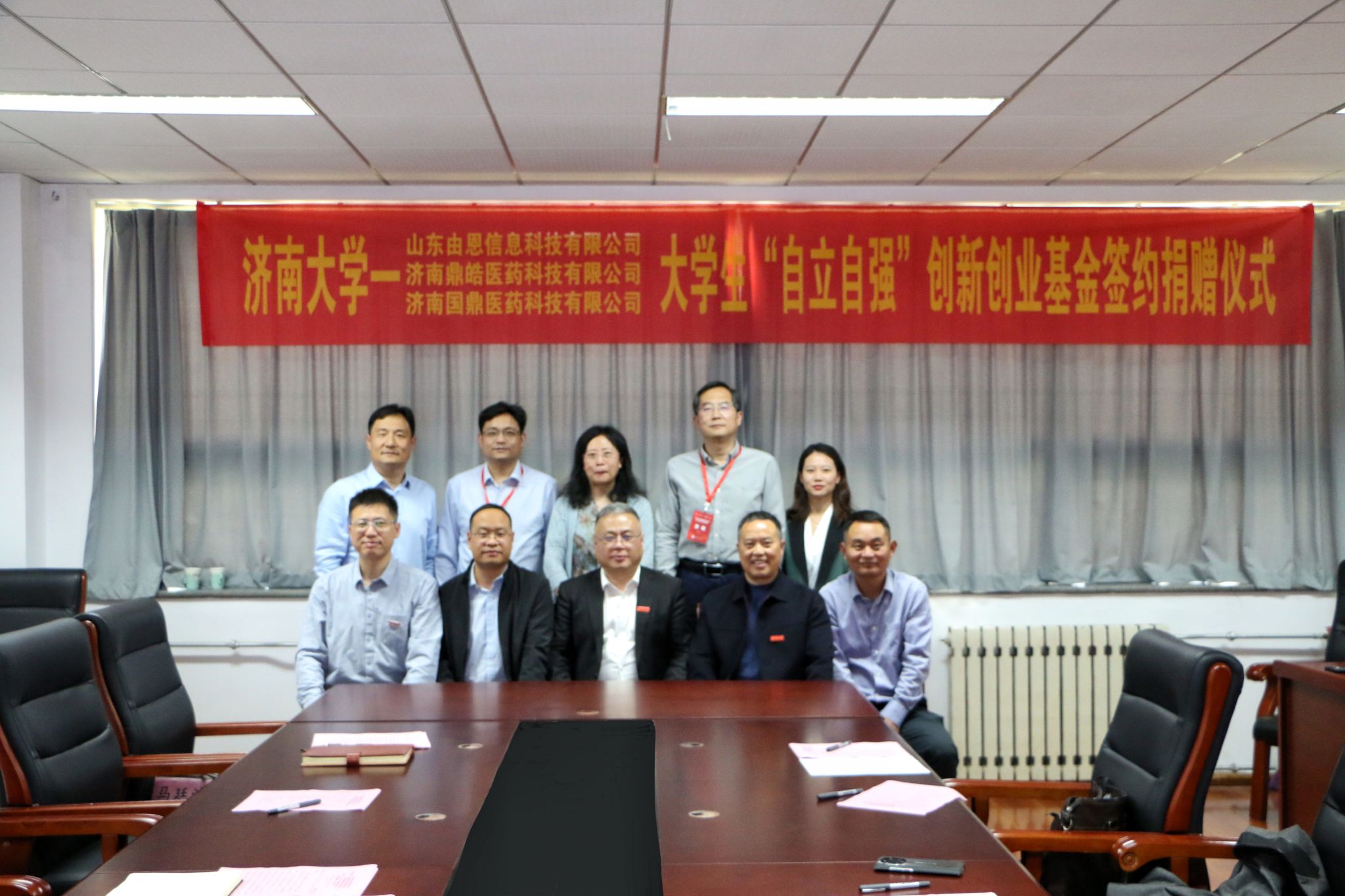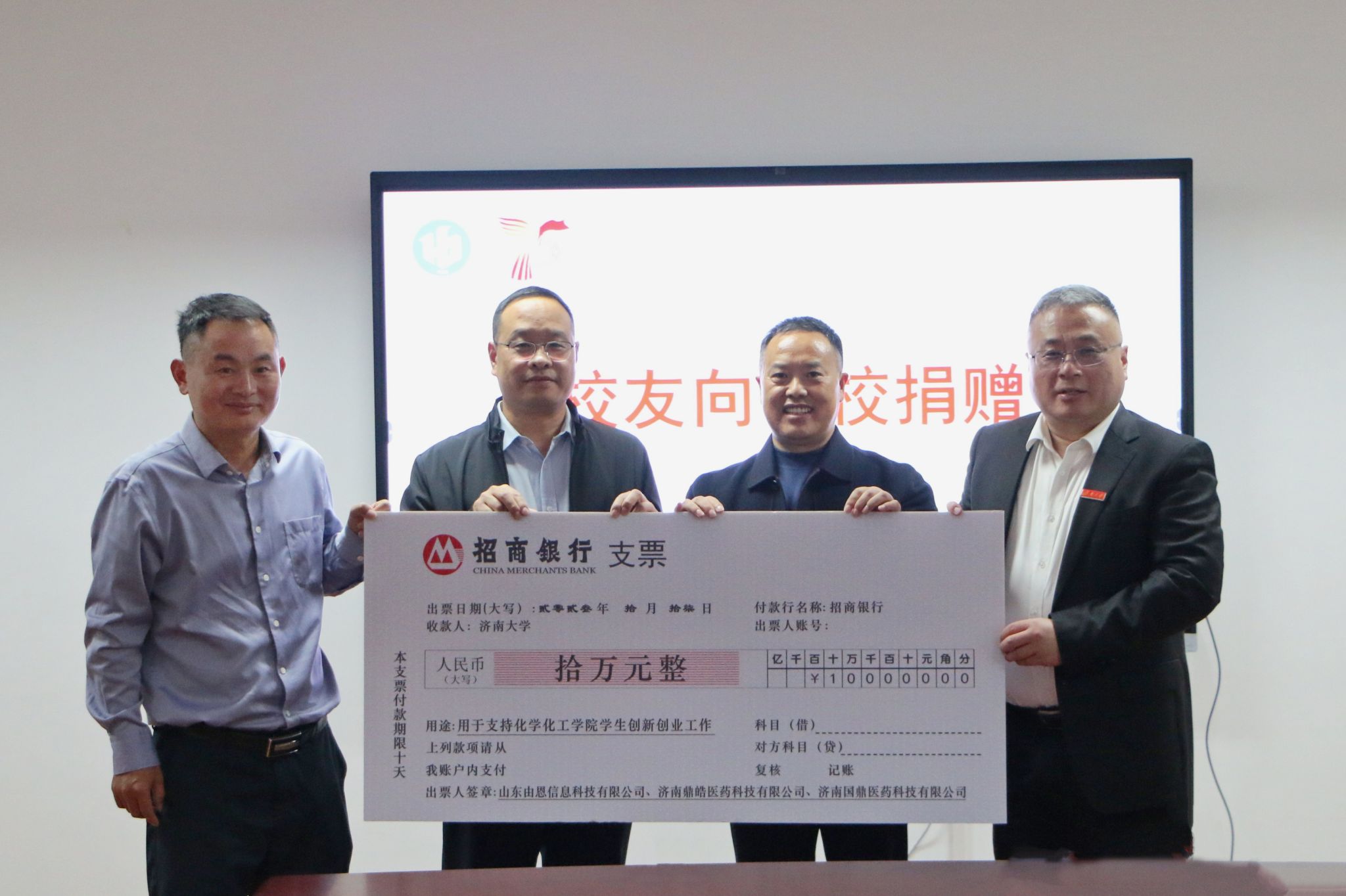 济南大学大学生“自立自强”创新创业基金由山东由恩信息科技有限公司、济南鼎皓医药科技有限公司和济南国鼎医药科技有限公司设立,捐资10万元用于支持化学化工学院学生创新创业相关工作。学院将把这笔资金用到实处,激励学生自立自强、敢闯敢干,将一代代校友秉承的“艰苦奋斗,凝心聚力,追求卓越”的济大精神传承下去。