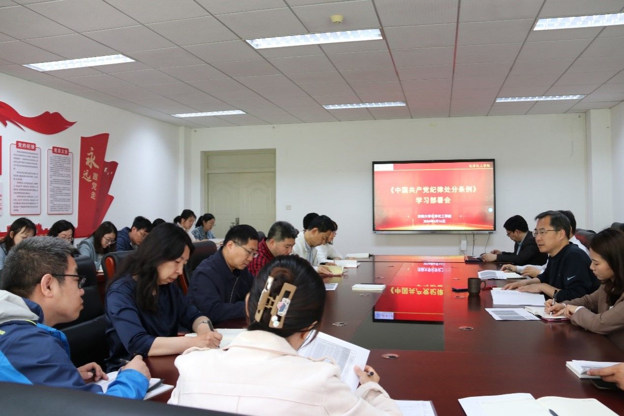 2024年4月16日上午,化学化工学院在逸夫楼A313召开学院党委扩大会议,专题部署学习《中国共产党纪律处分条例》,学院党委委员和全体师生党支部书记参加了会议。
